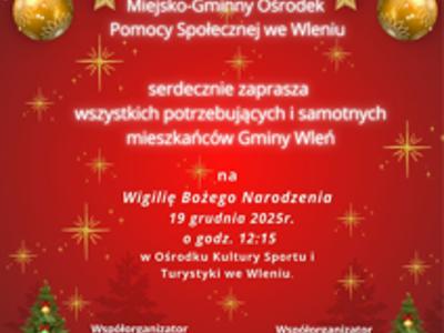 Kierownik MGOPS we Wleniu Anna Goryczka ma przyjemność zaprosić wszystkie osoby samotne i potrzebujące na tradycyjne spotkanie wigilijne z poczęstunkiem, które odbędzie się w piątek 19 grudnia 2025 r. o godz. 12.15 w Ośrodku Kultury Sportu i Turystyki we Wleniu. W wydarzenie zaangażowała się także parafia pw. św. Mikołaja Biskupa we Wleniu.